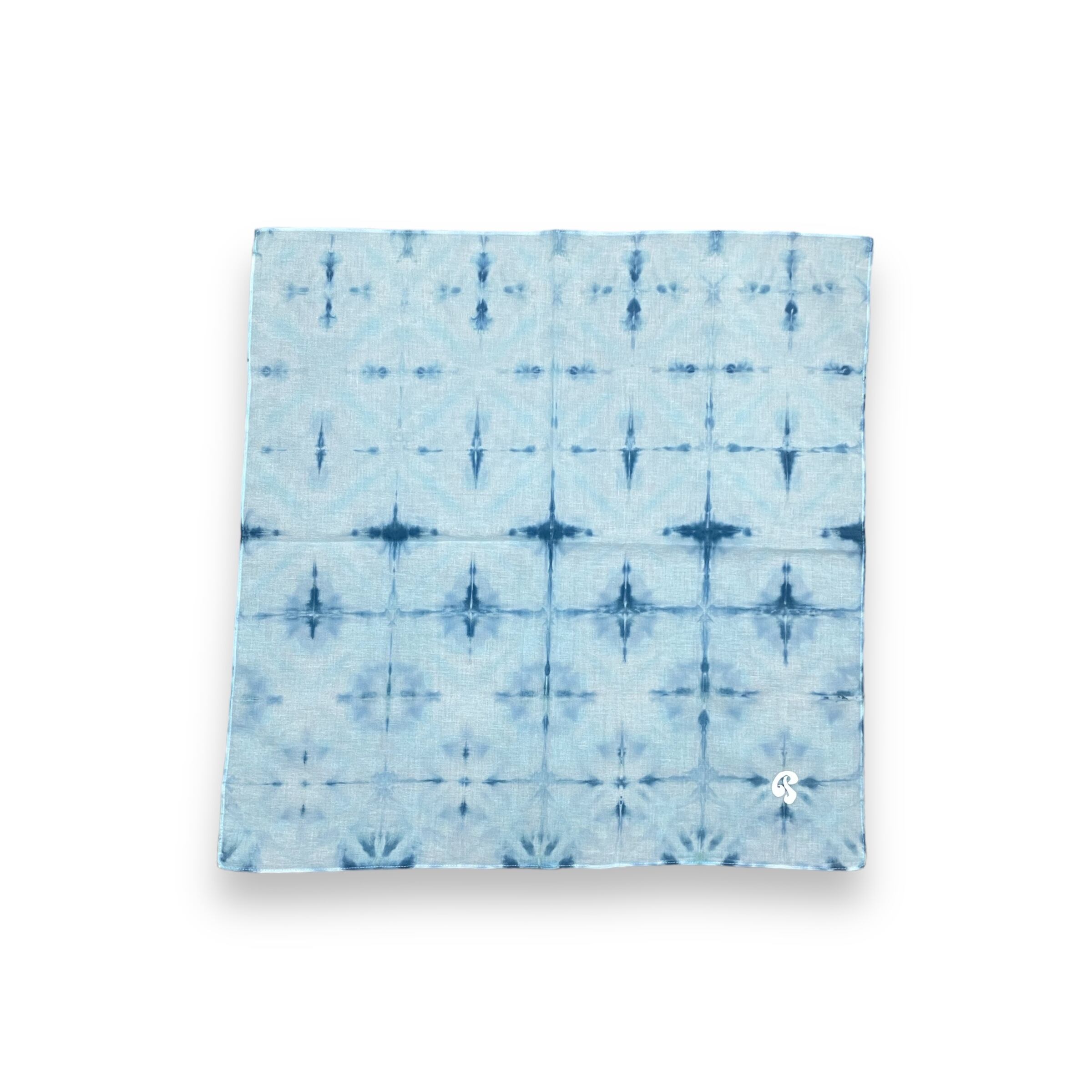 このアイテムはICE DYEという製法で染めています。通常のTIE DYEと違い、絞る工程(TIE)の後、氷を乗せ(ICE)、その上から染粉をのせることで、氷が溶けた水でバンダナが染まっていく(DYE)という技法です。そのため温度による独特な色の変化や、ゆっくりと染まっていく技法ならではの味わいを楽しむことができます。